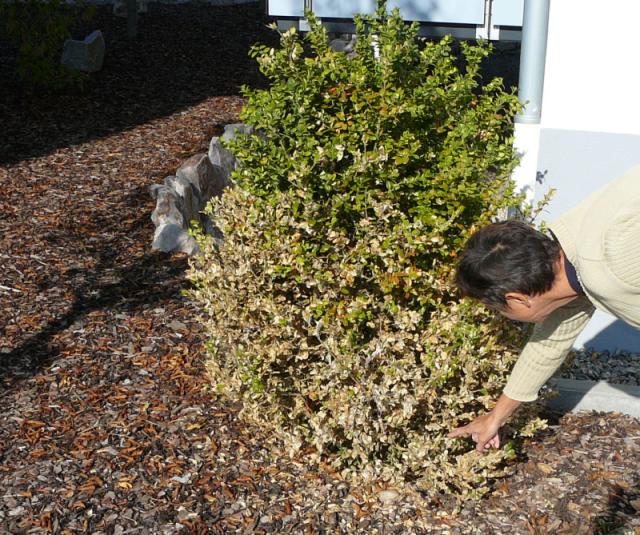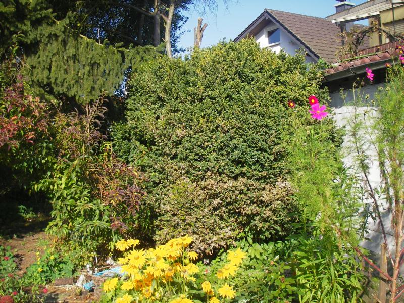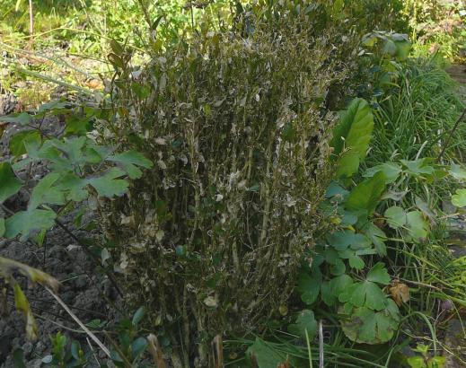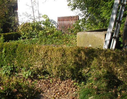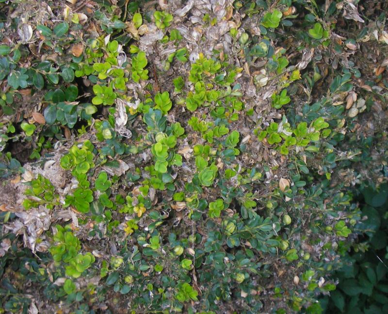 Ein großer alter Buchsbaum wurde bereits wegen Kahlfraß entfernt. Die Gartenbesitzerin berichtete, dass sie seit August mehrere Hundert Raupen entfernt hat, wobei sie den Buchs durchgekämmt hat. Wir fanden dennoch etliche leere Puppenhülsen nebst einigen noch nicht geschlüpften Puppen und einer erwachsenen Raupe. Wegen des Absammelns war nur ein geringer Teil vom Buchs kahlgefressen, doch waren praktisch überall Raupengespinste und -kot nachzuweisen. Lediglich unmittelbar neben einem Muskateller-Salbei (Salvia sclarea) war der Buchs fast unbefressen.
