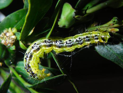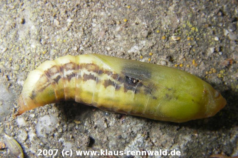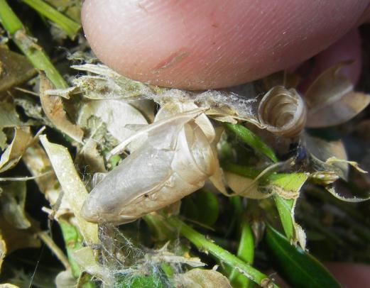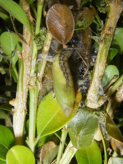 Auch die Puppen befinden sich im Inneren des Buchs, wo sie zwischen lose zusammengesponnenen Blättern aufgehängt sind. Auf der Rückfahrt zum Kaiserstuhl entlang des Rheins habe ich in fast allen Dörfern zwischen Neuried-Altenheim und Ihringen Buchs auf das Vorkommen von G. perspectalis hin untersucht. Interessanterweise konnte ich keinen einzigen Hinweis auf diese Art erzielen. Es liegt die Vermutung nahe, dass die Art ihren Eivorrat in der Regel nicht über größere Distanzen verteilt. In Kehl gibt es allerdings etliche Gärtnereien, Baumschulen, Blumenläden etc., die Buchs verkaufen.